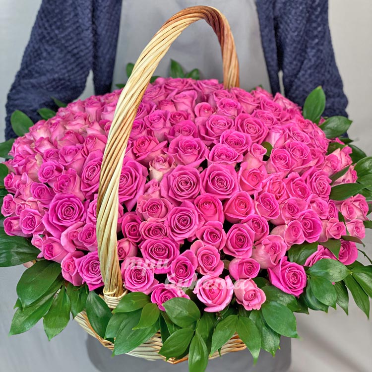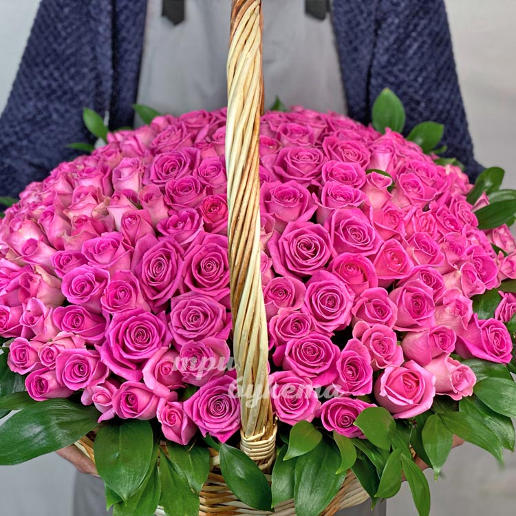 151 розовая роза в большой корзине