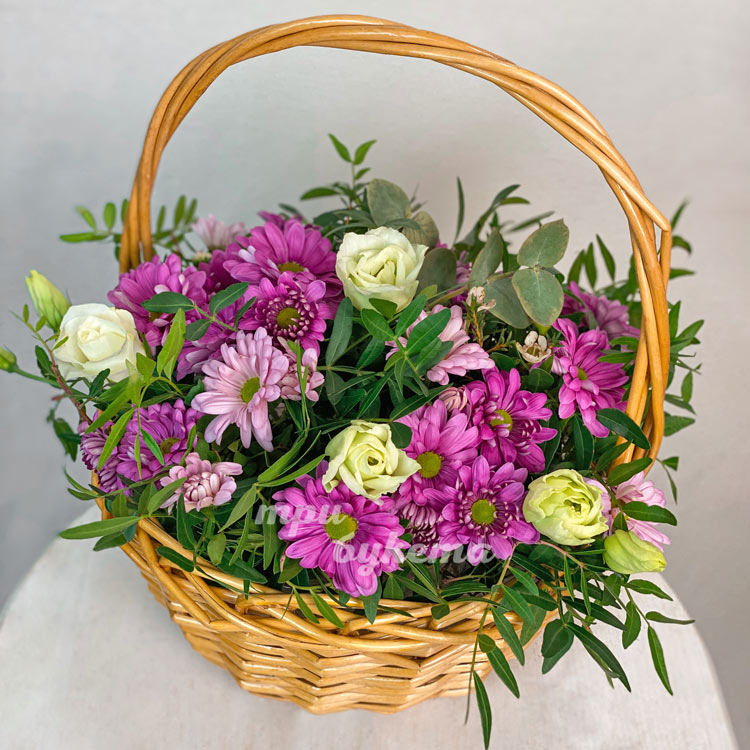 8 розовых хризантем в корзине