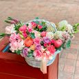 Кашпо бордовых, розовых и оранжевых роз