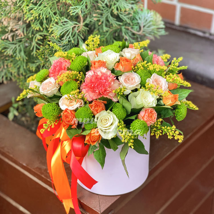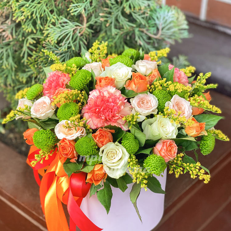 Коробка роз с зелеными хризантемами