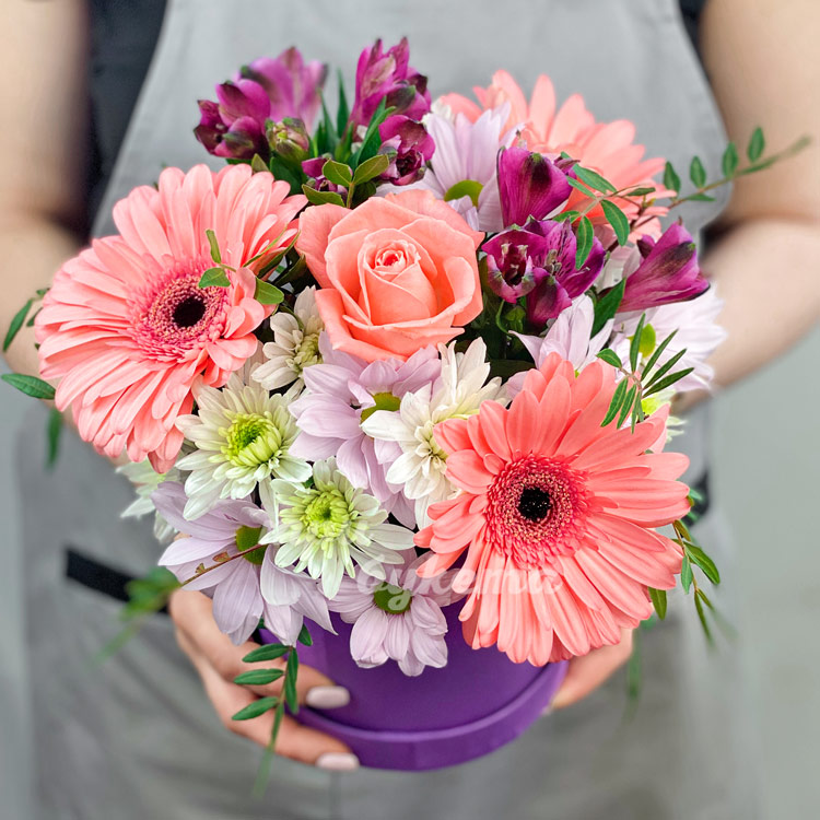 Коробка с хризантемами и персиковыми герберами