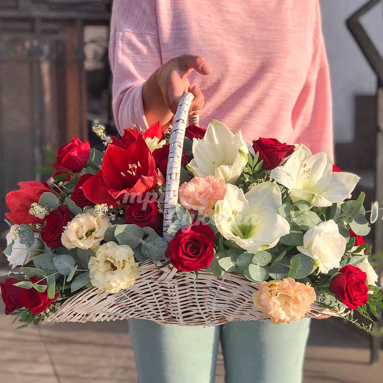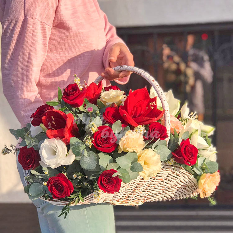 Корзина с амариллисами и розами