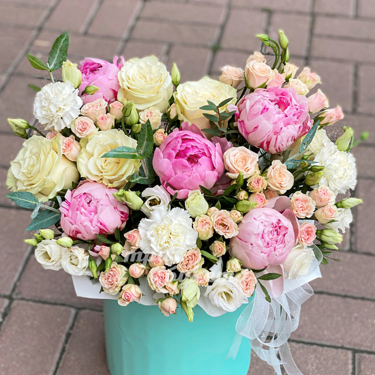 Пионы и розы в коробке